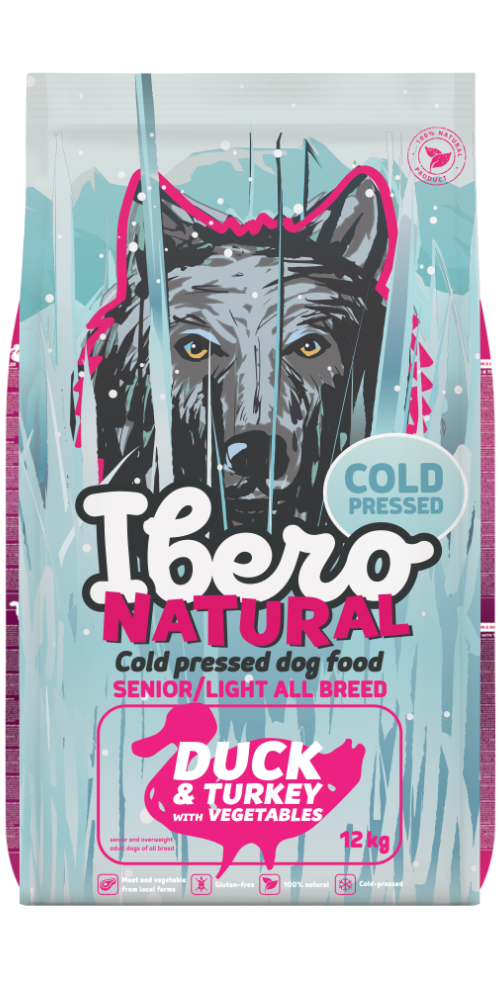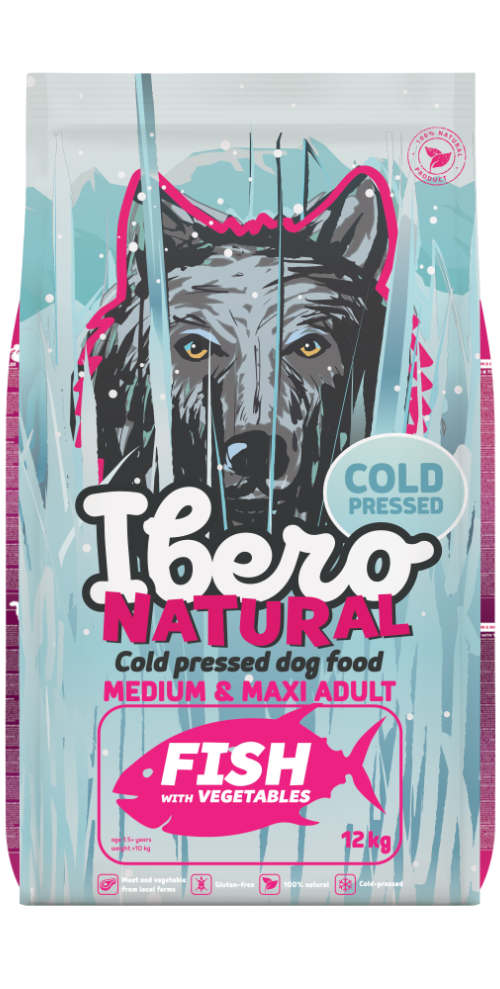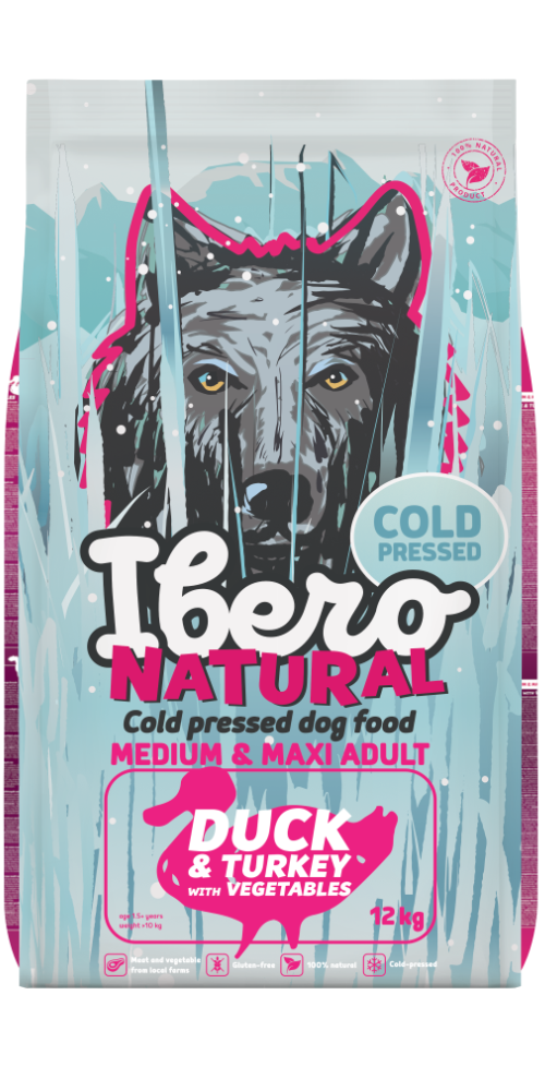 Ibero Cold Pressed dry food is a cold-pressed food inspired by the natural BARF diet. Unlike the Ibero Natural line, which focuses on high meat content, Ibero Cold Pressed also contains sweet potatoes, potatoes and other natural ingredients that support healthy digestion and overall vitality of your dog. Thanks to light production at low temperatures, the dry food retains maximum nutrients, is easy to digest and does not expand in the stomach, reducing the risk of torsion. The dry food is available in small breed and medium/large breed options, also for junior or adult dogs. It is available in five delicious flavours - beef, duck, iberian pork, fish and lamb - so that every dog can find their favourite taste.